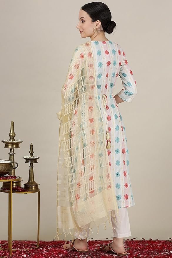 Fabric: This 95% rayon, 5% zari kurta for women is made with premium rayon quality; trouser is made with rayon, dupatta is made with viscose rayon. The kurta set has long-time wearability and is friendly to skin.