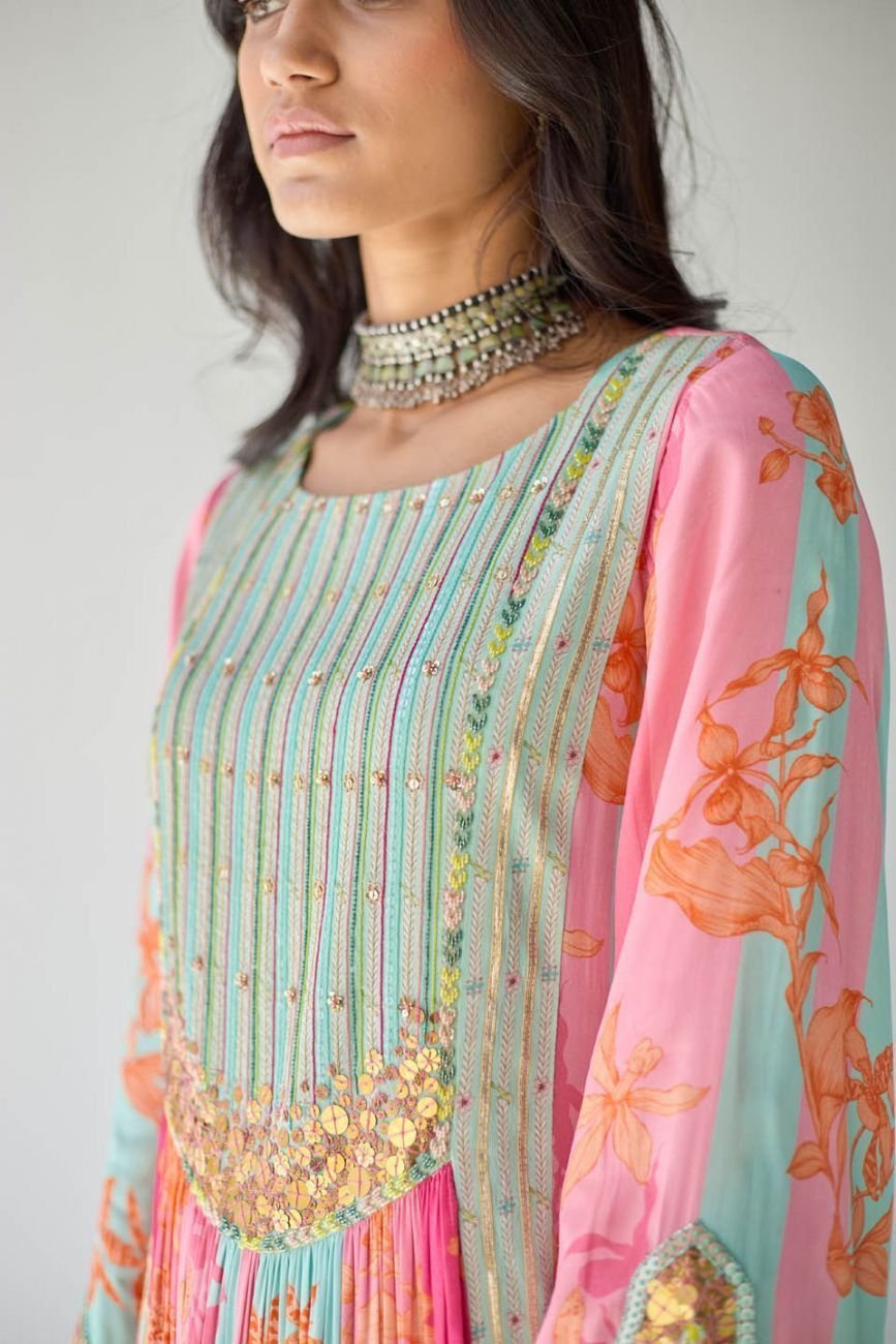 - Pink printed kurta set with blue hand embroidered pallazo and lime green organza dupatta