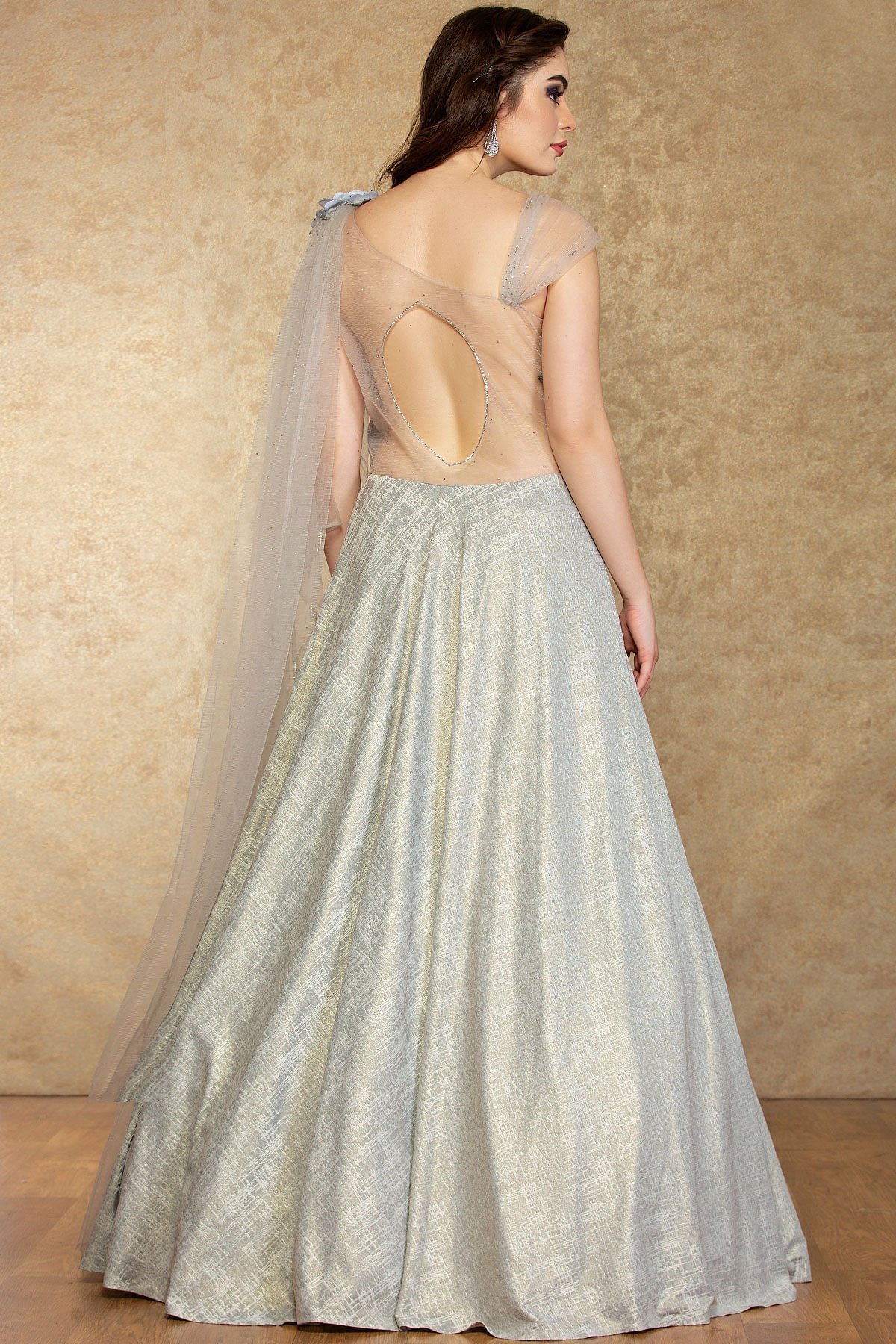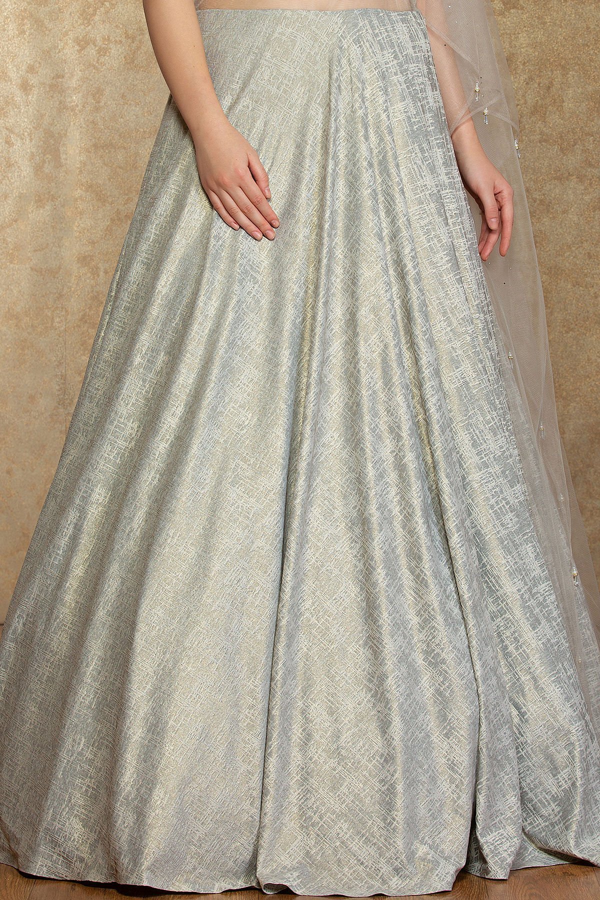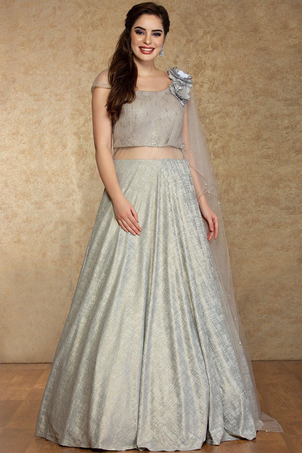 Welcome the effortlessly elegant light grey color silk and net fabricated evening gown to your party wear collection. Trimmed with delightful self texture, stone anad applique work, this undeniably feminine gown with attached net dupatta will lend a sophisticated touch to any event. This ensemble spells both feminine and sophistication, the full length plays host to the most glamorous parties. There might be a little color variation in the image and original product due to photographic lighting sources or your monitor settings.