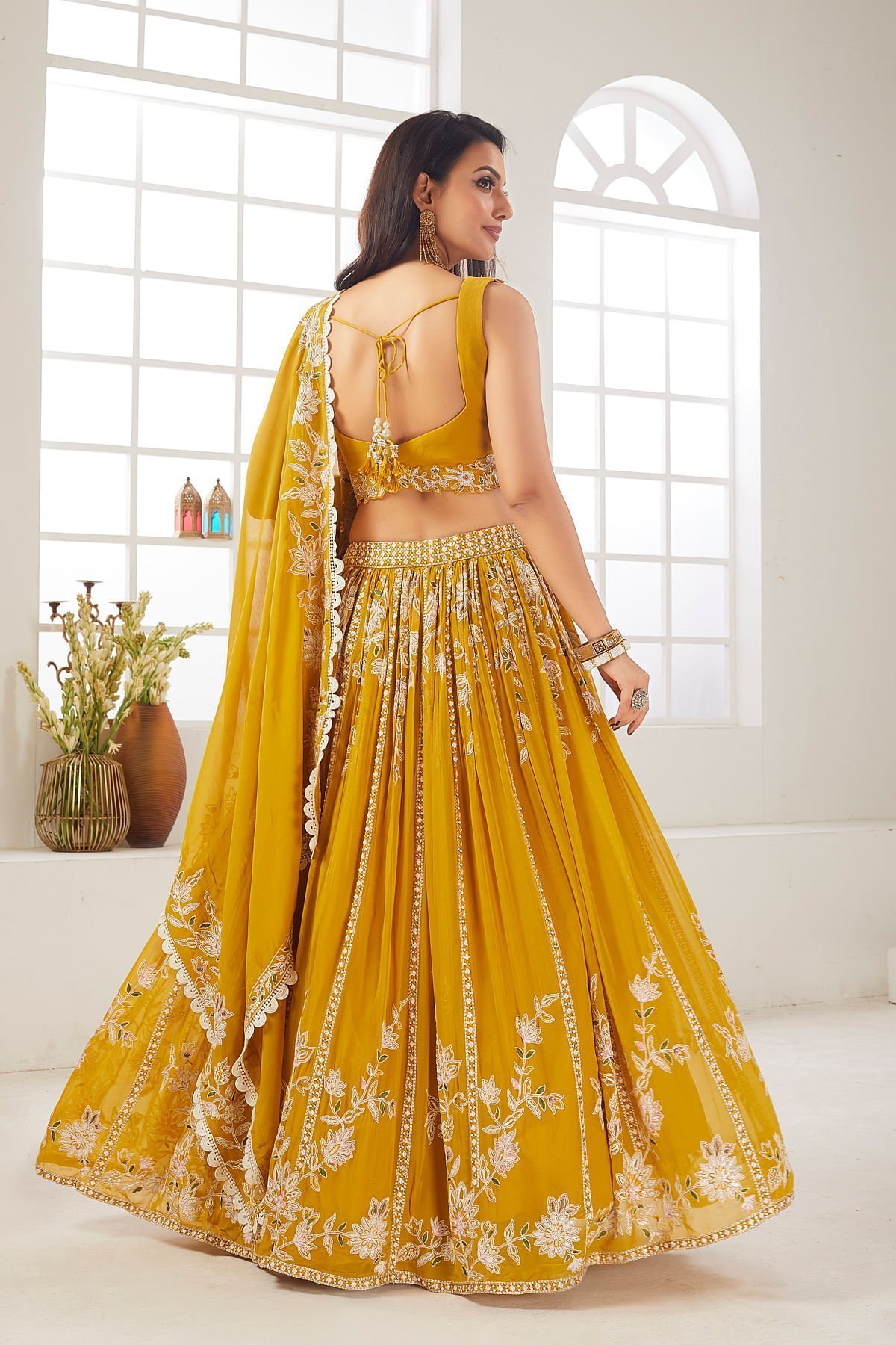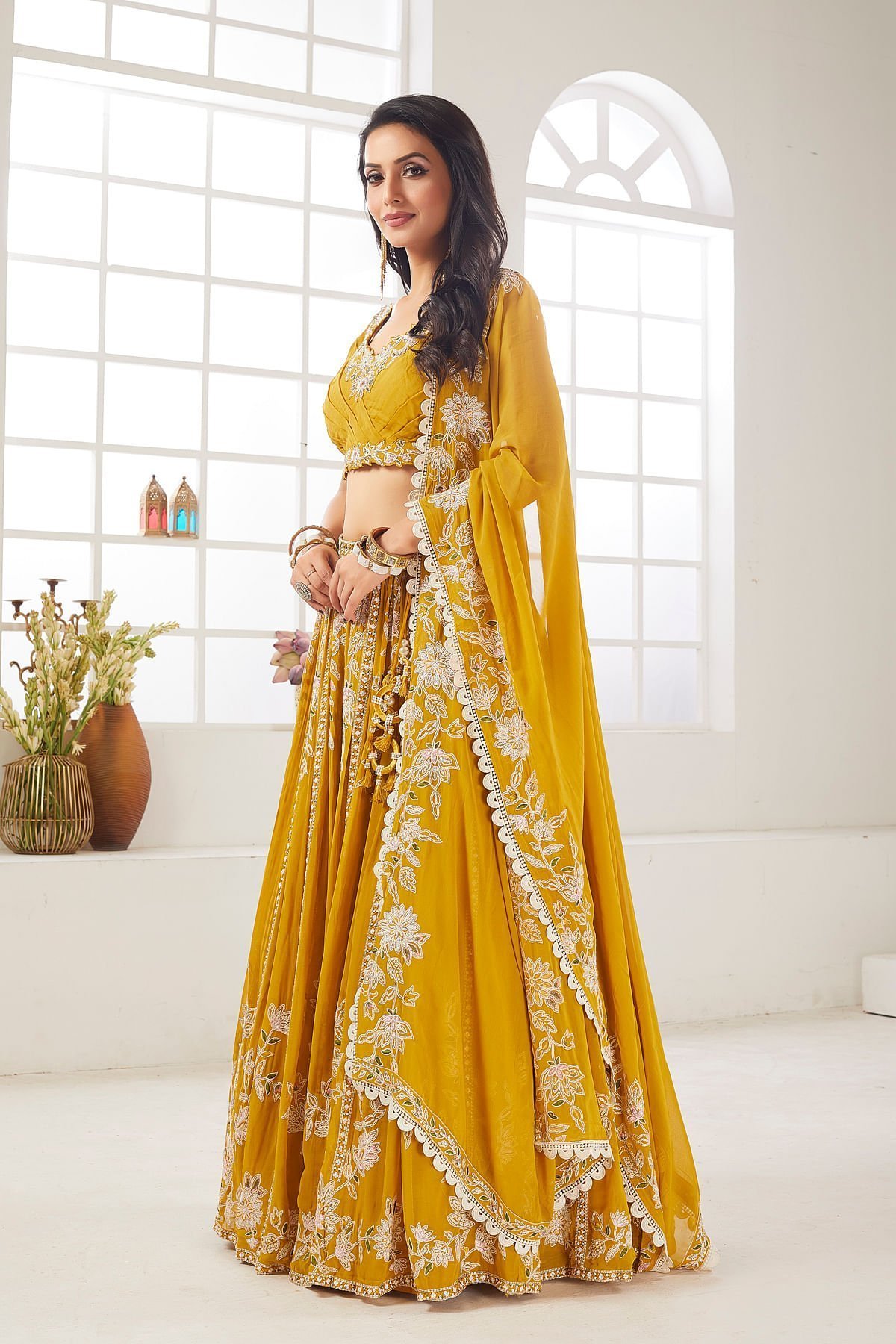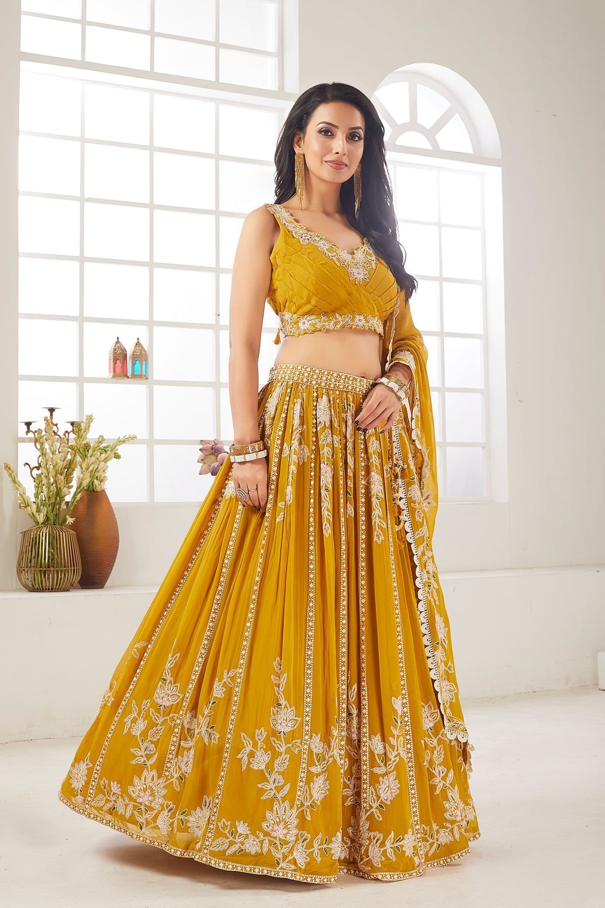 Elevate your style with this exquisite Spectra Yellow Georgette Lehenga Choli set, perfect for festive occasions. The lehenga, with a length of 112 cm, features intricate Sequins, Resham, and Zari work, adding a touch of glamour to your look. The embroidered Georgette fabric and gathered style provide a luxurious feel, while the pure and vibrant yellow color exudes elegance. The accompanying Spectra Yellow Georgette dupatta, adorned with Sequins, Resham, Lace, and Zari work, complements the ensemble beautifully. The readymade choli with a tie-back neck, leaf neck pattern, and sequins, zari, and resham work adds a contemporary twist. Embrace timeless fashion with this stunning outfit. Complete the look by wearing Stone jewelry with barcelet and crown braided stuck with flowers hairstyle. There might be little color variations in the image and original product due to photographic lightings or your monitor settings.