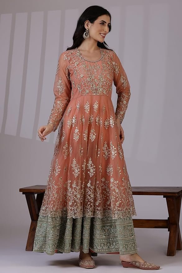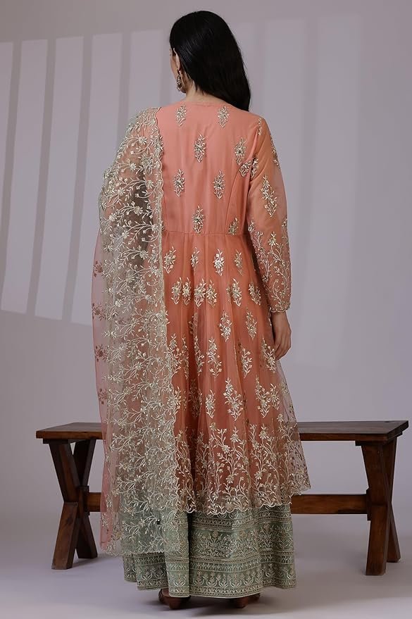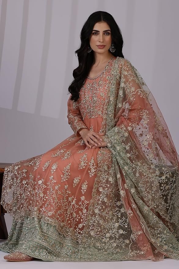 Style this beautiful heavy festive dress and dupatta set with our jewellery and heels to get statement look.